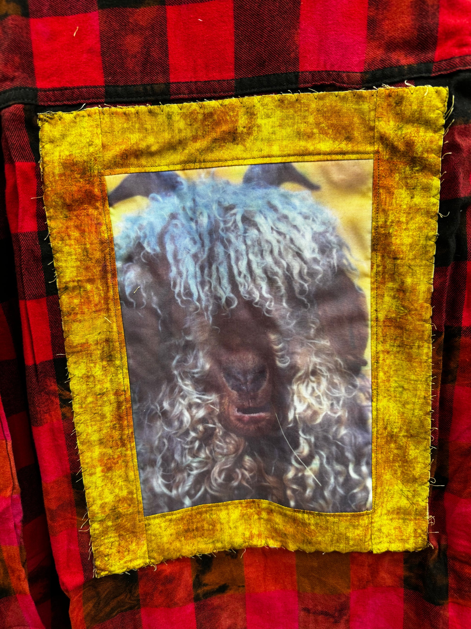 Loving this beautiful brown angora! Can you say, stinking cute? This yummy flannel shirt is a head turner and sure to be a big hit. No duplicates. Distressed & Redesigned in the USA.