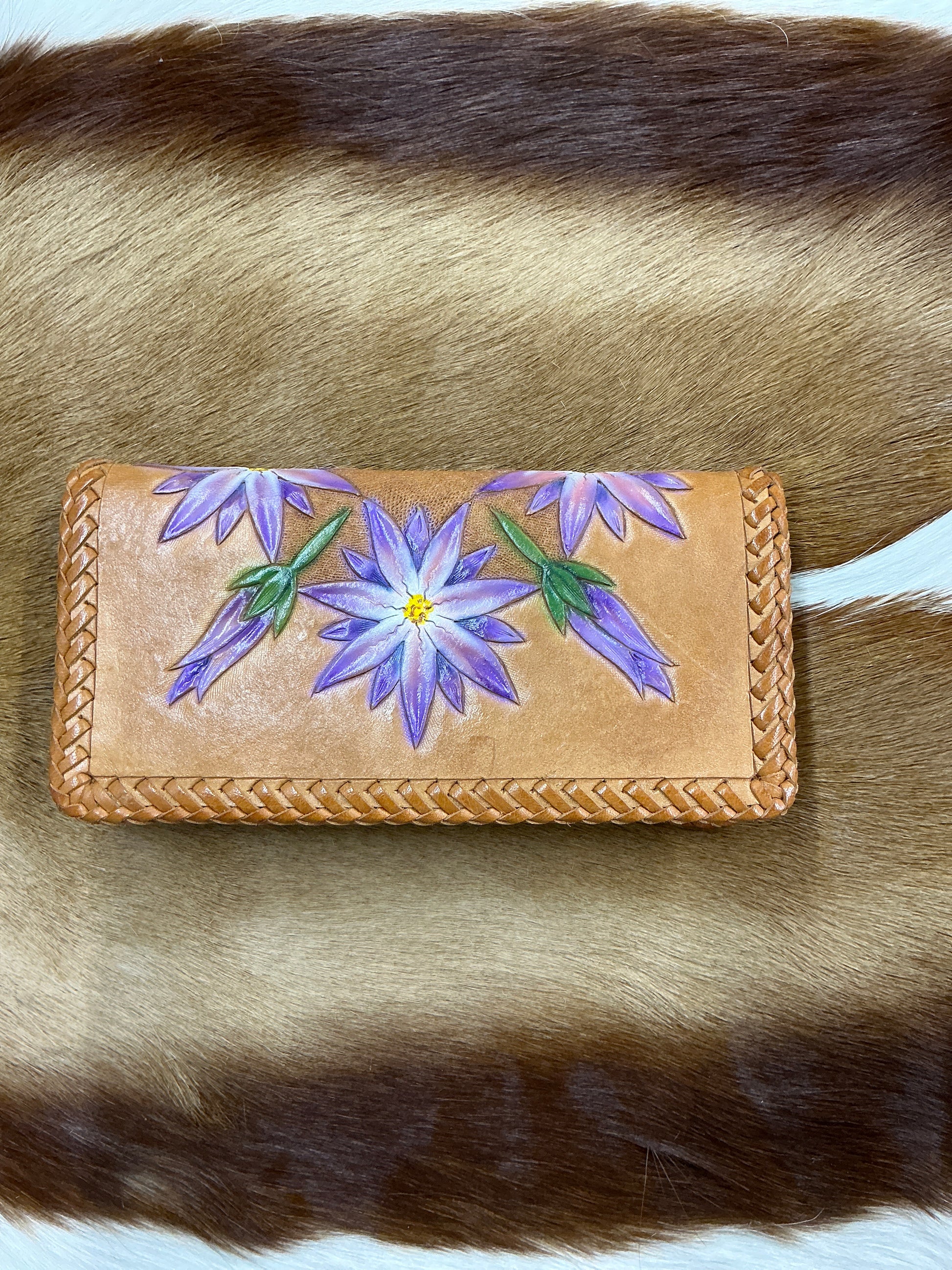 Gorgeous tooled, painted floral leather checkbook cover with slots for cards. Made in the USA.
