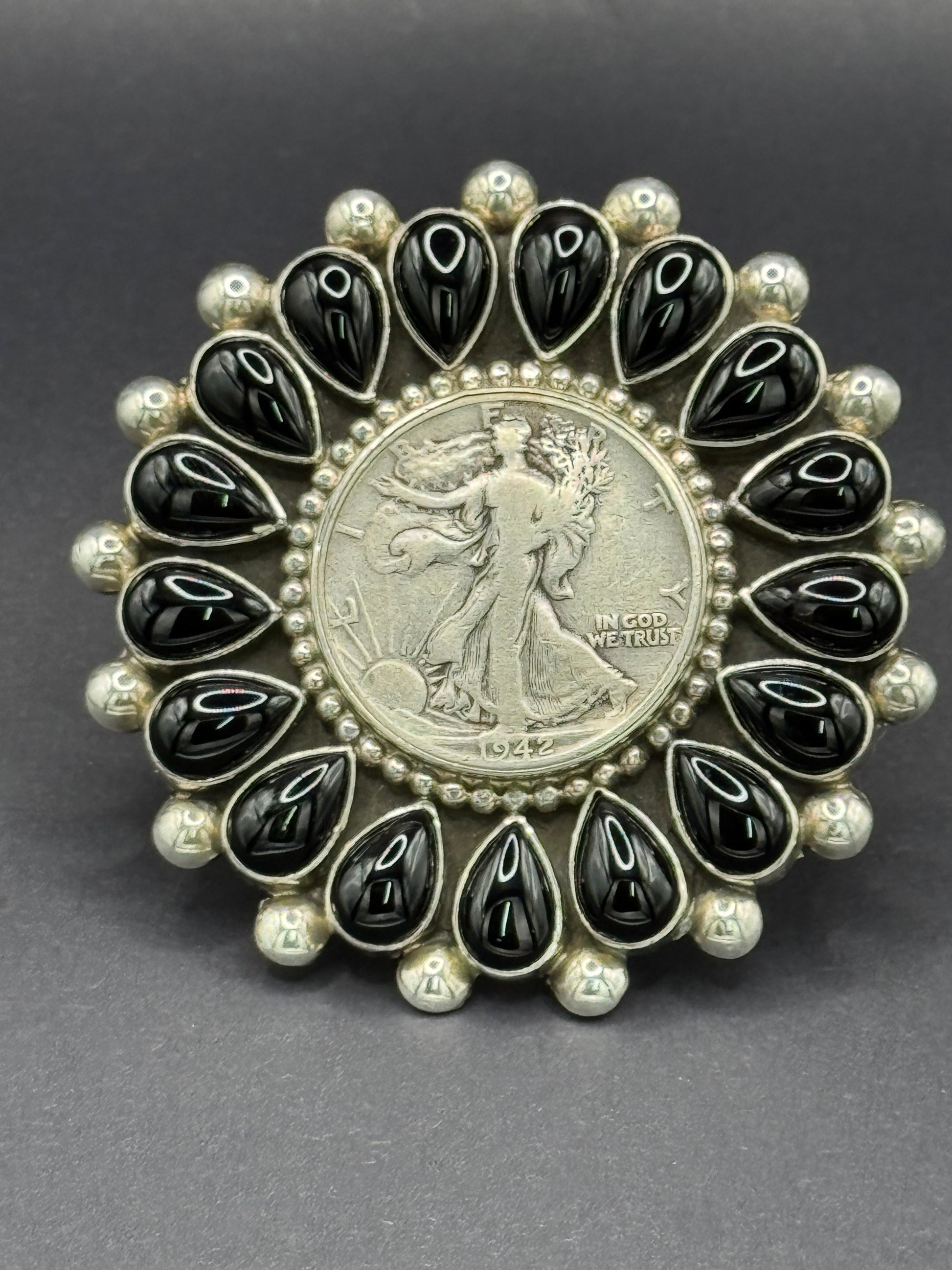 TJR Black Onyx Lady Liberty Sterling Silver, Adjustable Coin Ring