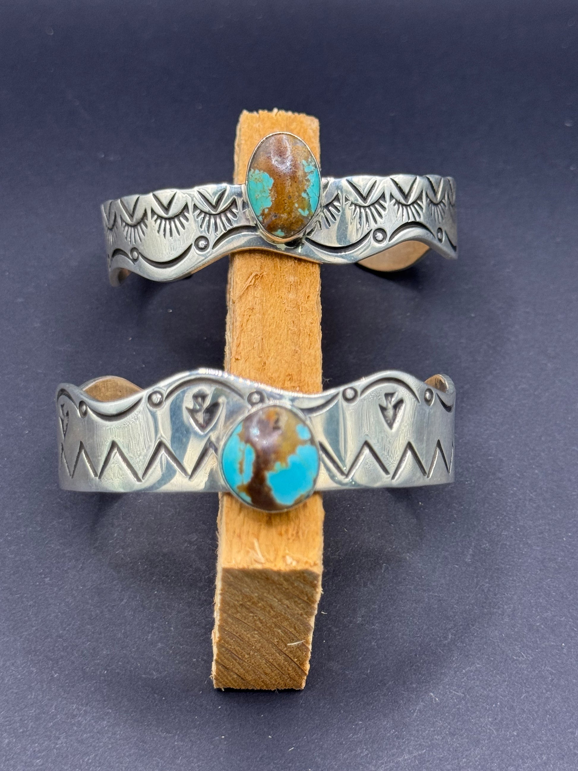 Beautiful sterling and turquoise stacker cuff (incredible detailing) by Virgil Reeder. You can wear as singles or together.